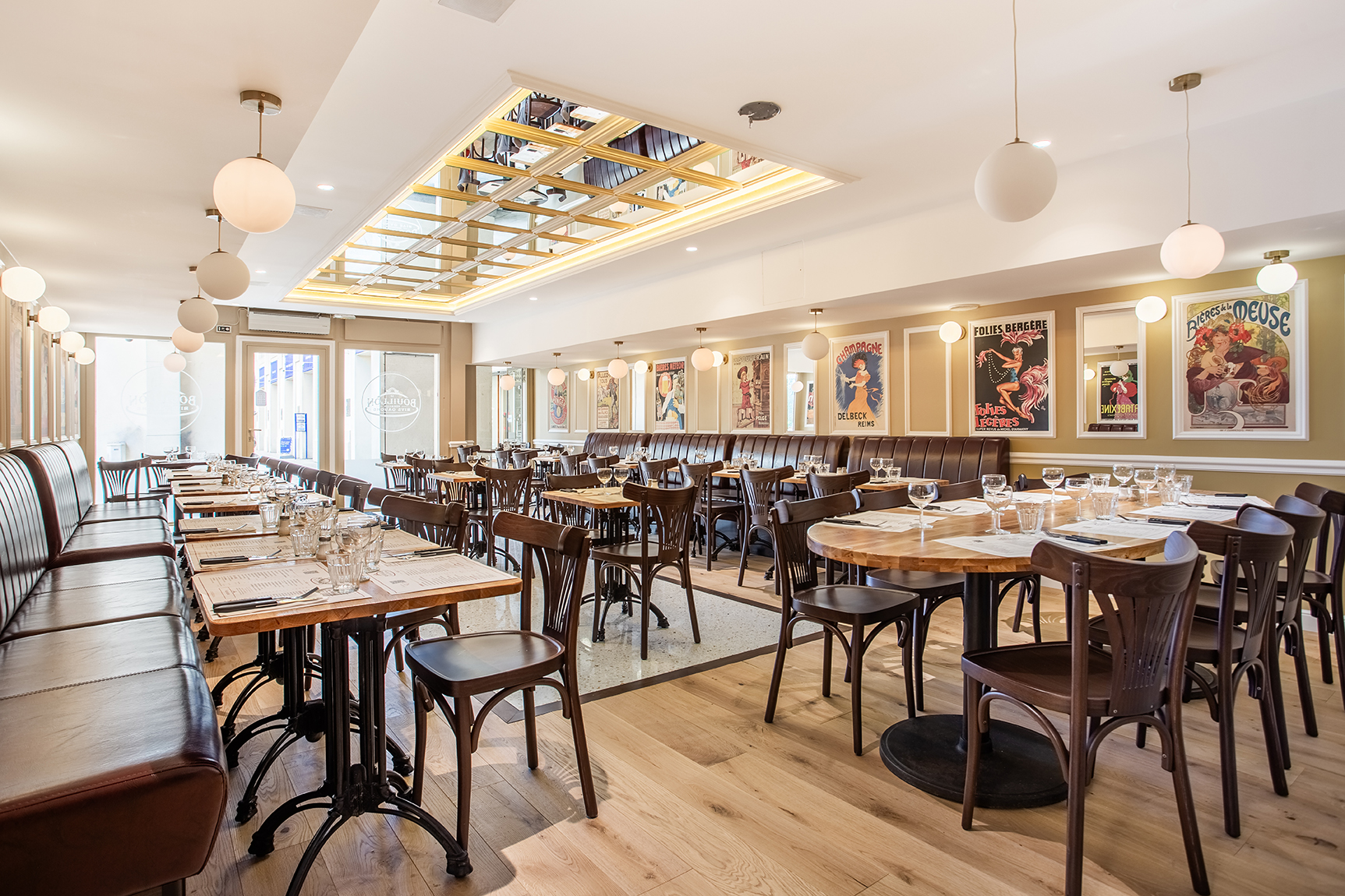 Le restaurant est enveloppé de teintes crème et terracotta ce permet de diffuser une lumière douce et chaleureuse. Les murs, habillés de moulures et de cadres, accueillent une sélection d’affiches de réclame inspirées de l’Art nouveau, apportant une touche graphique et nostalgique qui renforce l’âme du lieu.